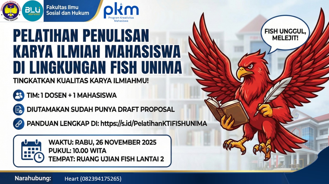 Selamat datang di Website Fakultas Ilmu Sosial dan Hukum Universitas Negeri Manado. Melalui laman ini, kami hadirkan jendela informasi yang mencerminkan komitmen fakultas dalam mengembangkan pendidikan, penelitian, dan pengabdian kepada masyarakat berbasis nilai-nilai humanis dan keilmuan yang berintegritas. Fakultas Ilmu Sosial dan Hukum Universitas Negeri Manado menjadi ruang kolaboratif bagi sivitas akademika untuk berinovasi, berdaya saing, dan berkontribusi bagi pembangunan bangsa. Kami berharap website ini menjadi sarana interaktif yang memperkuat konektivitas, transparansi, dan pelayanan akademik yang unggul.